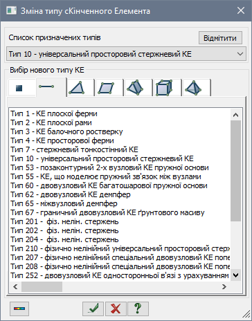 Після побудови розрахункової схеми, рекомендується за допомогою параметрів відображення перевірити тип елементів за допомогою встановлення прапора Типи КЕ (діалог Показати, вкладка Елементи). Якщо на введеному елементі буде обрано не той тип, то необхідно натиснути кнопку - Зміна типу КЕ (вкладка "Розширене редагування", панель "Схема" (рис.1-3)). Відкриється однойменний діалог (рис. 3).