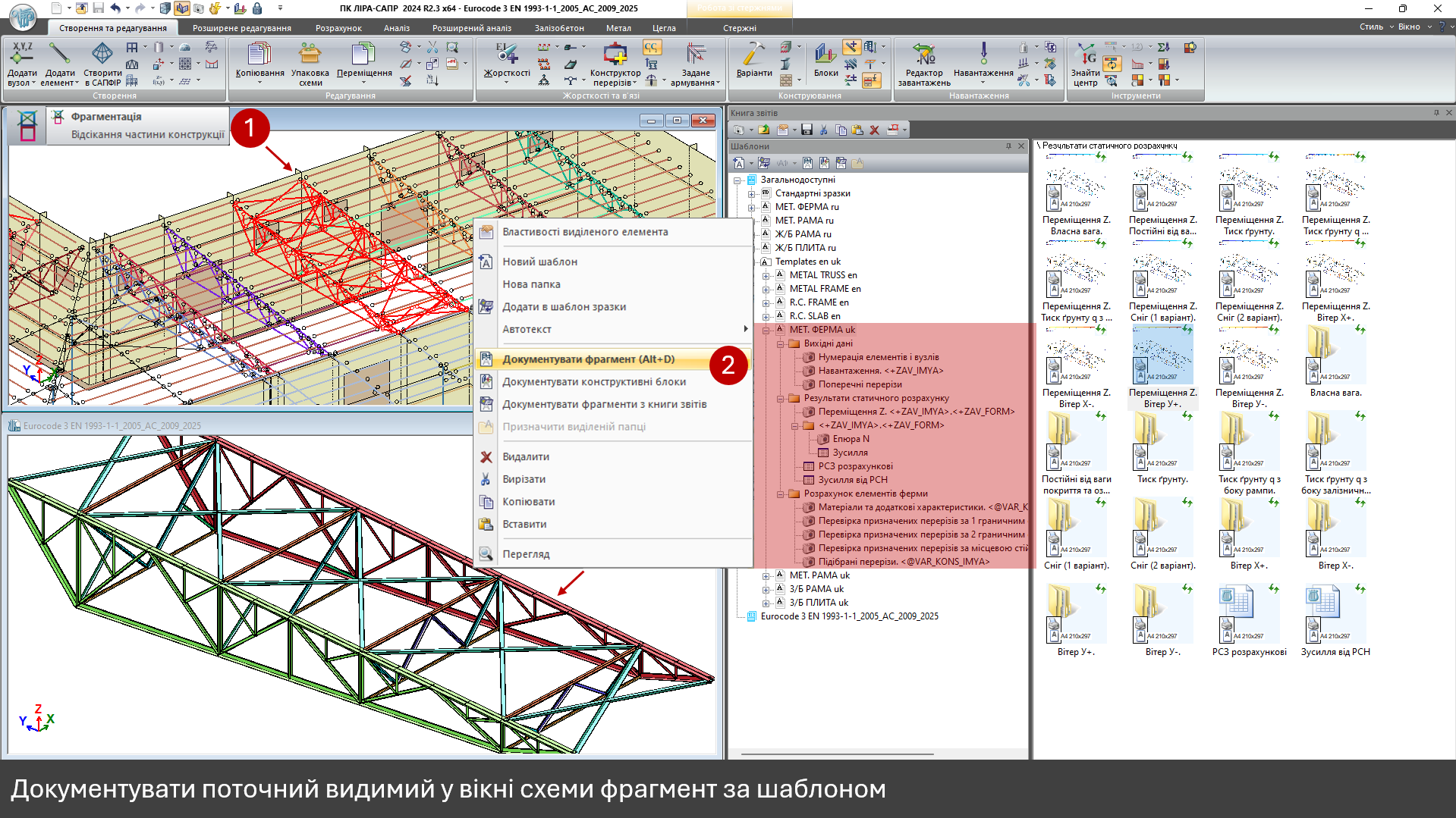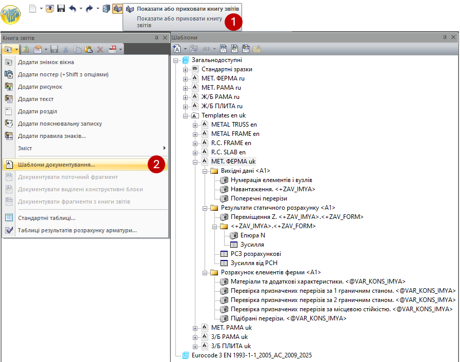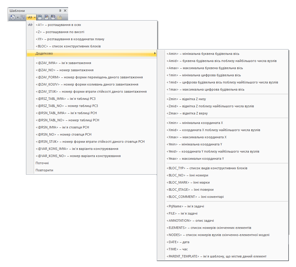 Як видно з порівняння рис.1 та рис.2, з одного елемента шаблону під назвою «Навантаження. <+ZAGR>» було створено декілька елементи книги звітів: «Навантаження. Власна вага» та «Навантаження. Постійні від ваги покриття» та ін. Це сталося завдяки автотексту «<+ZAGR>» в імені елемента шаблону. Аналогічно, через ознаки перерахування, створилися зображення епюр і переміщень по кожному завантаженню. Подібні автотексти з модифікаторами (рис. 4) у шаблоні документування дозволяють автоматично згенерувати документацію з усіх завантажень, варіантів конструювання, РСН, РСУ тощо одним натисканням по клавіші миші.