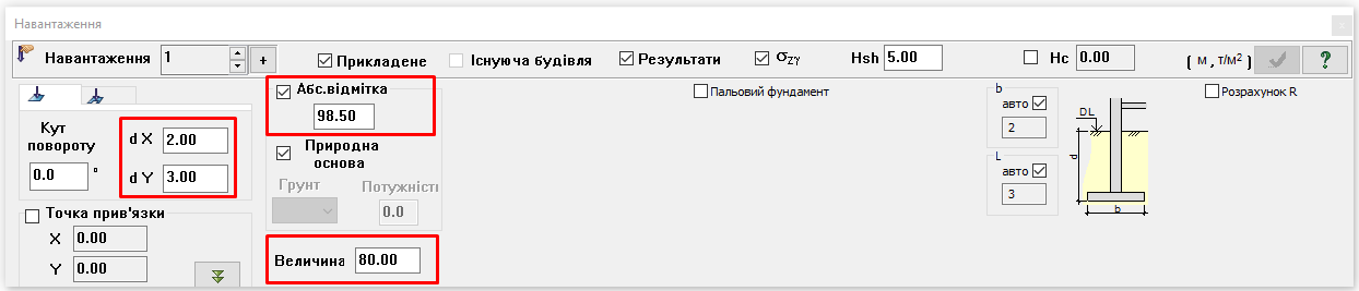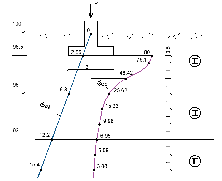 Необхідно визначити осадку стовпчастого фундаменту. Геометричні розміри підошви 2х3 метри, глибина закладення – 1.5 метри. Середній тиск під підошвою фундаменту становить Р = 80 т/м2. ДТиск від піщаного насипу на поверхні органічного ґрунту р = 6.8 т/м2, модуль деформації ґрунту E = 1050 т/м2.