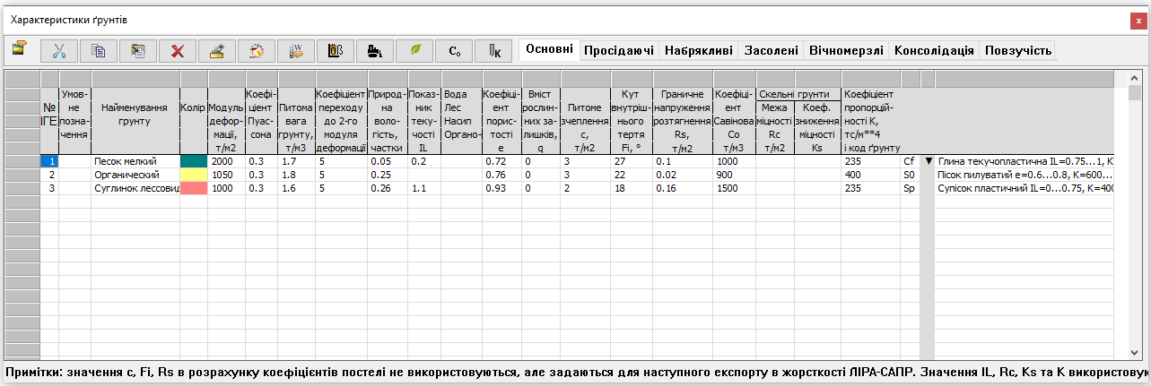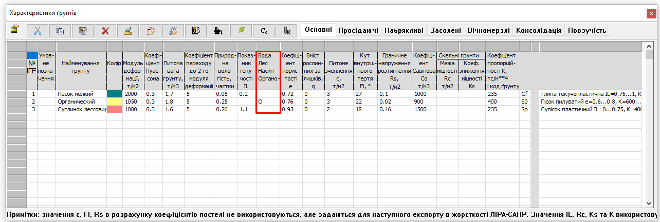 Для розрахунку деформацій водонасиченого органічного ґрунту – достатньо лише призначити відповідну ознаку. Для цього, в колонці «Вода – Лес – Насип – Органо-мінеральний» (на рис. 4 виділено червоним кольором), навпроти насипного шару потрібно поставити букву «О» (від англ. organic soil – органічний ґрунт).