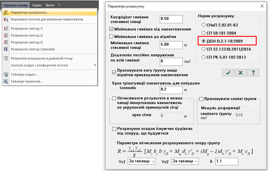 Розрахунок деформацій основи з урахуванням специфічних властивостей ґрунтів можливий при розрахунку по нормах ДБН В.2.1-10-2009, тому вибираємо для розрахунку відповідні норми. Для цього, у меню потрібно натиснути на вкладку «Пружна основа» і перейти у «Параметри розрахунку». У діалоговому вікні «Параметри розрахунку» потрібно вибрати норми ДБН В.2.1-10-2009 (рис. 5).