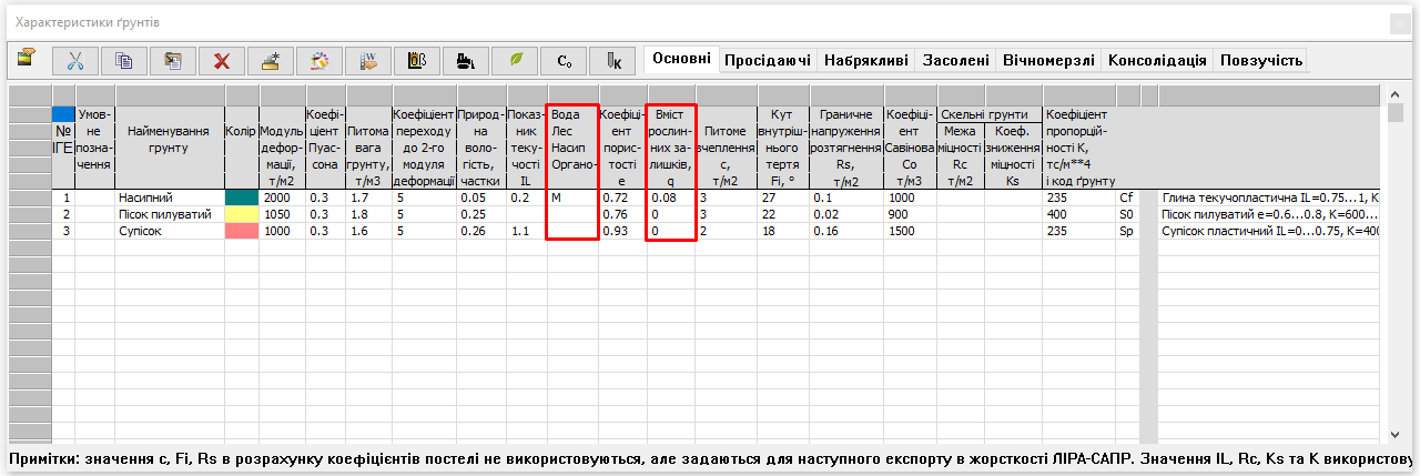 Для розрахунку деформацій насипного ґрунту – необхідно призначити відповідну ознаку. Для цього, у колонці «Вода –Лес – Насип – Органо-мінеральний» (на рис. 4 виділена червоним кольором), навпроти насипного шару потрібно поставити букву «М» (від англ. man-made soil – насипний ґрунт).