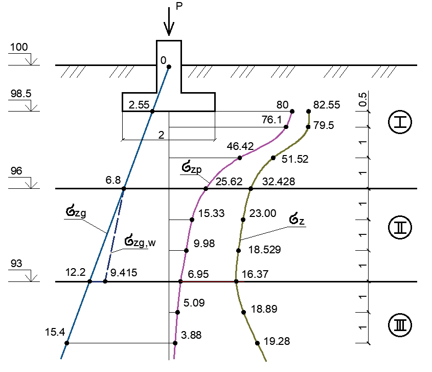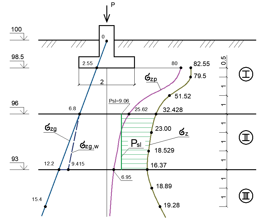 Просідаючі деформації нарощуються в межах просідаючої товщі Hsl. Просідаюча товща вимірюється від підошви фундаменту (або від верхньої відмітки шару просідаючого ґрунту) до глибини, де сумарні вертикальні напруження від зовнішнього навантаження і власної ваги ґрунту дорівнюють початковому просідаючому тиску (ДБН В.2.1-10-2009 «Основи та фундаменти споруд», Д. 18). При цьому напруження від власної ваги ґрунту приймаються у його водонасиченому стані.