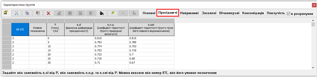 Результати компресійних випробувань задаються у діалоговому вікні «Характеристики ґрунтів», при переході на вкладку «Просідаючі» (рис. 3). У таблиці характеристик просідаючих ґрунтів потрібно задати наступні параметри: