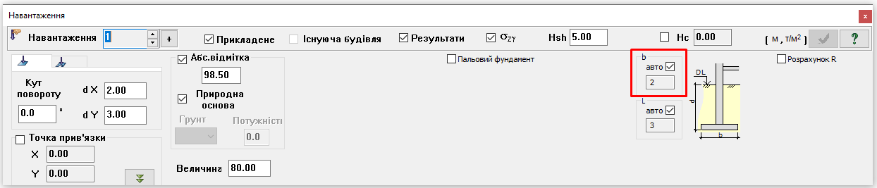 Ширина фундаменту задається у діалоговому вікні «Навантаження» у відповідному полі (на рисунку 1 виділено червоним кольором). При натисканні галочки «авто» – ширина фундаменту обчислюватиметься автоматично. Якщо прибрати галочку «авто» – тоді користувач може сам задати величину ширини фундаменту.