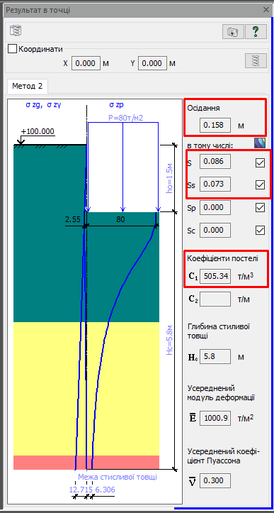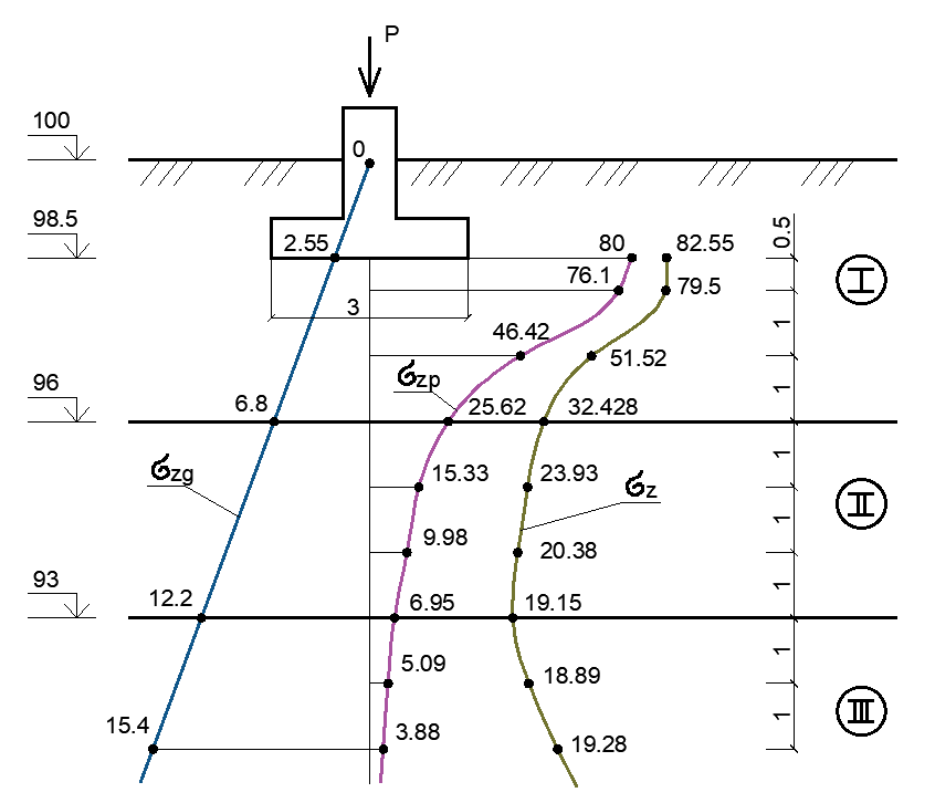 На рисунку 1 показані графіки напружень від власної ваги ґрунту та від зовнішнього навантаження, що були пораховані заздалегідь.