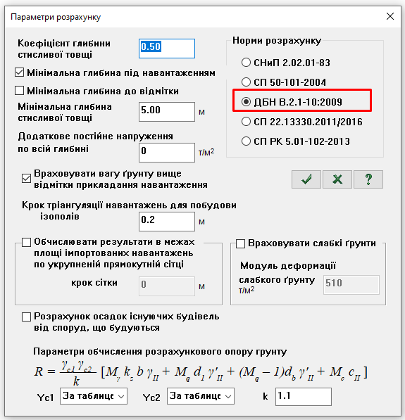 Для того, щоб задати нижню межу зони усадки Hsh потрібно вибрати розрахунок по нормах ДБН В.2.1-10-2009. Для цього потрібно перейти на вкладку «Пружна основа», потім на вкладку «Параметри розрахунку», та у діалоговому вікні «Параметри розрахунку» вибрати відповідні норми (рис. 3). Потім, у діалоговому вікні «Навантаження» у вікні Hsh потрібно встановити відповідне значення нижньої межі зони усадки (рис. 4), за умовчанням Hsh приймається рівним 5 м.