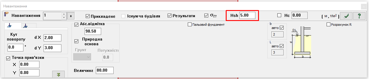 Якщо користувач не поставив нижню межу зони усадки, вона автоматично приймається рівною - 5 метрів (ДБН В.2.1-10-2009 «Основи та фундаменти споруд», Д. 27).