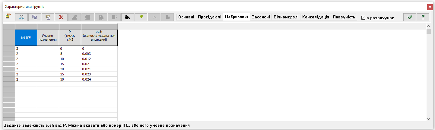 Відносна усадка εsh задається у діалоговому вікні «Характеристики ґрунтів», при переході на вкладку «Набрякливі» (рис. 2). У таблиці характеристик набухаючих ґрунтів необхідно задати наступні параметри: