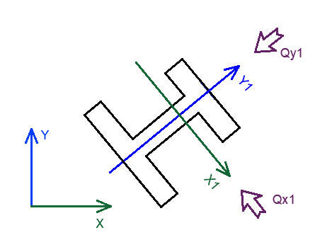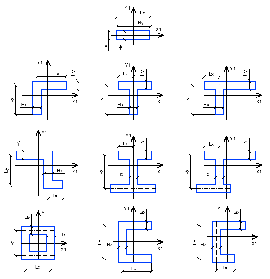 У даному розрахунку розізнаються наступні форми простінків: прямокутник, куточок, тавр, двотавр, хрест, швелер, переріз типу Z, короб. Кожен із перерізів має свою власну систему координат з осями X1, Y1, яка може не збігатися із загальною системою координат розрахункової моделі XоY. Зовнішні навантаження прикладаються до розрахункової схеми у глобальній системі координат, тому в даному розрахунку розглядаються проекції діючих зусиль на локальні осі простінка X1,Y1 (рис. 1).