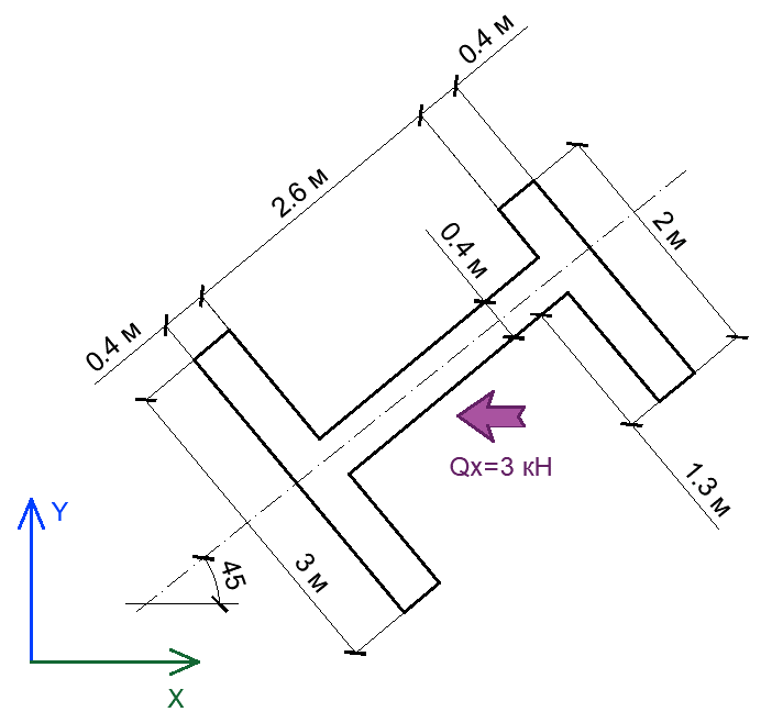 Необхідно виконати аналіз спільної роботи поперечних та поздовжніх стін простінка, що показано на рисунку 5. Діючі зусилля: N = 30 кН, Qx = 3 кН. Характеристики кладки: Rtw = 0.25 МПа, Rsq = 0.24 МПа. Висота поверху Н = 3 метри. Площа перерізу простінка А = 3.04 м2. Моменти інерції перерізу відносно локальних осей X1 и Y1: IX = 4.99 м4, IY = 1.33 м4.