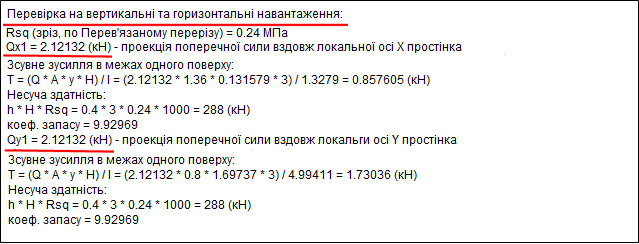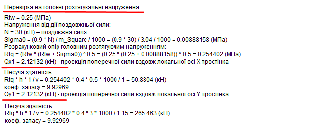 Але для таких простінків можна побачити результати розрахунку на головні розтягуючі напруження (формула 4). Для цього потрібно скористатися файлом звіту .тхт, у якому розписані всі перевірки.
