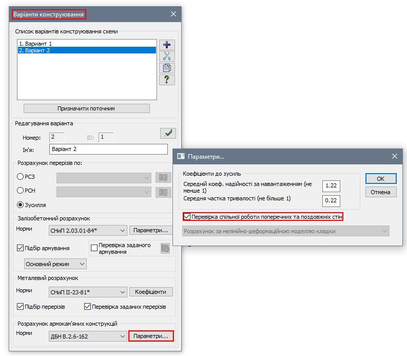 Для того, щоб виконати аналіз спільної роботи поперечних та поздовжніх стін, необхідно відкрити діалогове вікно «Варіанти конструювання». У розділі «Розрахунок армокам'яних конструкцій» потрібно натиснути на кнопку «Параметри». У діалозі «Параметри», що відкрився, потрібно поставити галочку «Перевірка спільної роботи поперечних і поздовжніх стін» (Рис. 12).