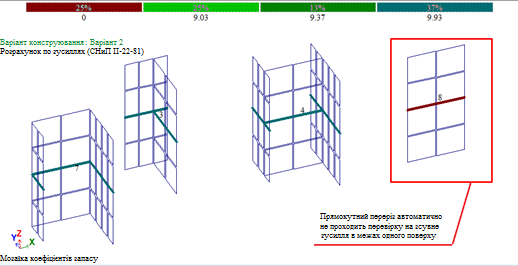 Тому, при перегляді ізополів за коефіцієнтом запасу, такі перерізи відразу потрапляють у діапазон «помилок» (Рис. 4). Це зроблено для того, щоб звернути увагу користувача на те, що є простінки, які погано сприймають вплив поперечного навантаження, і для кращої спільної роботи поперечних і поздовжніх стін можна поміняти розташування простінків.