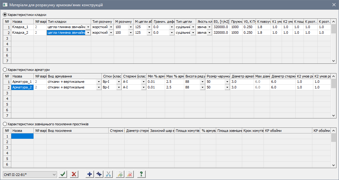 Характеристики матеріалів задаються у діалоговому вікні «Матеріали для розрахунку армокам'яних конструкцій», рис. 13.