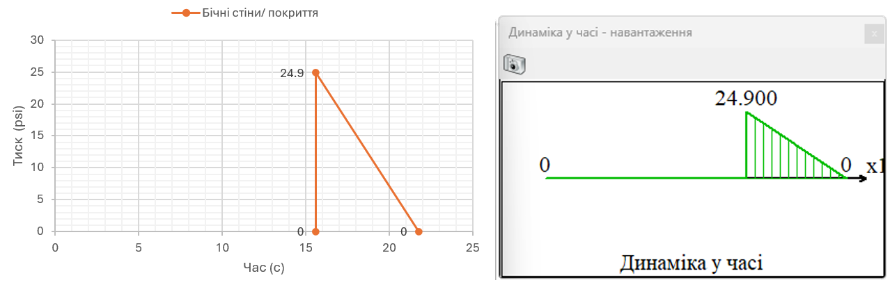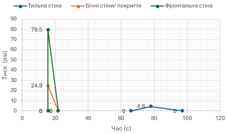Навантаження на фасадні, бічні, тильні стіни та покриття можуть бути співставлені таким чином, щоб відобразити залежність загального тиску від часу та показати, як дія повітряної ударної хвиля вплине на різні частини конструкції з плином часу (рис. 11).