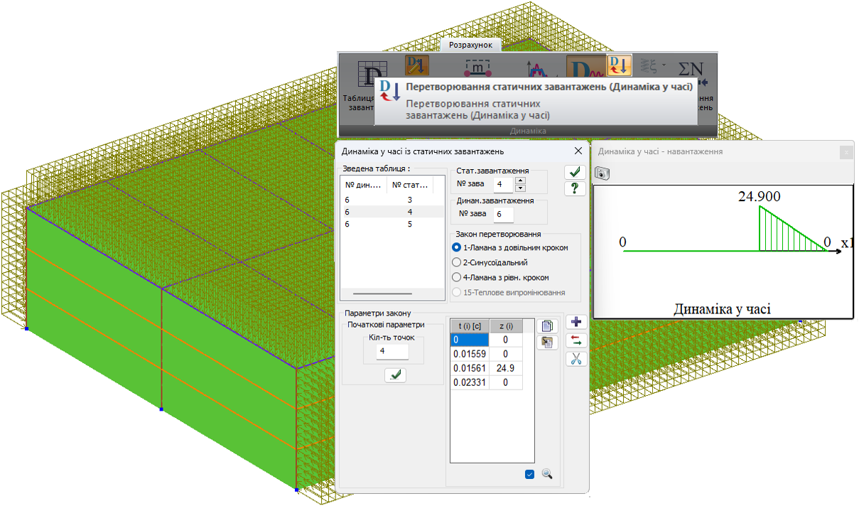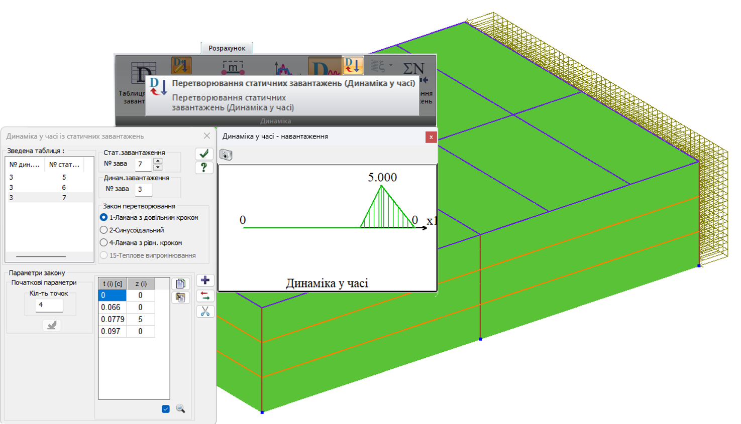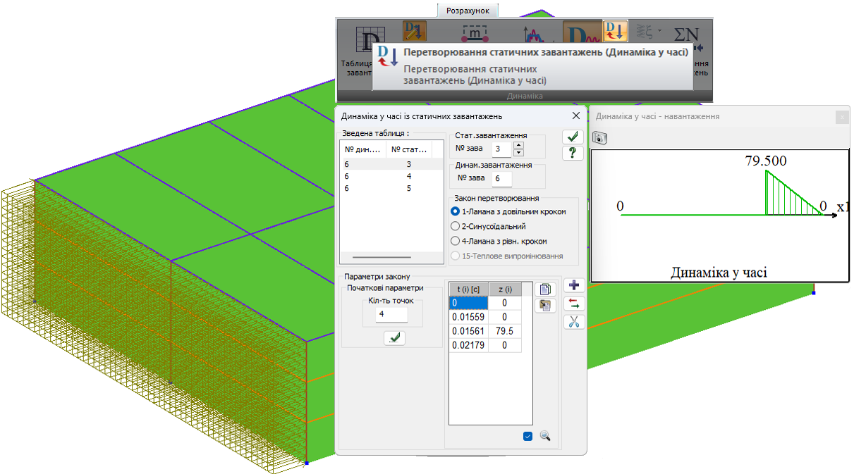 Примітка. Пізніше, на стадії формування динамічного навантаження із статичних, будемо задавати графік зміни навантаження під час дії повітряної ударної хвилі. Величини навантаження з цього графіка будуть автоматично множитися на число яке задається як інтенсивність статичного навантаження.