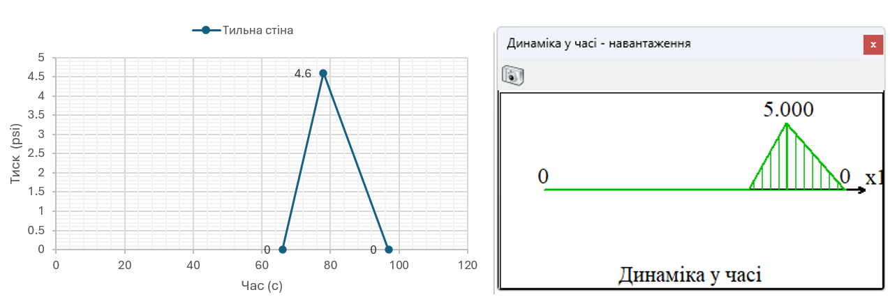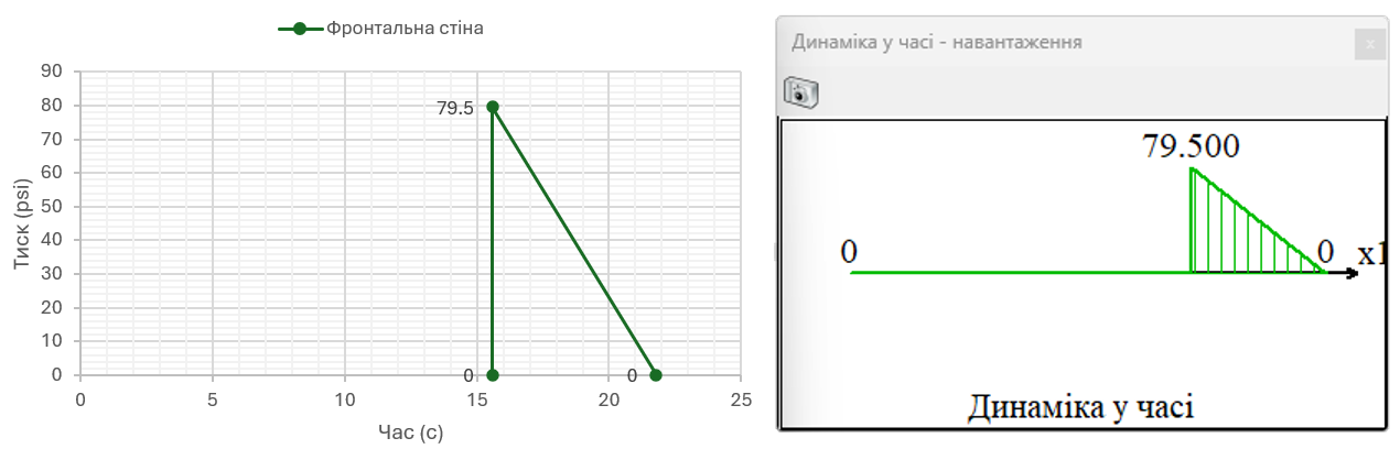 Якщо об'єднати всі змінні, розраховані вище для тильної стіни, то графік тиск-час для цього розрізу будівлі буде завершено.