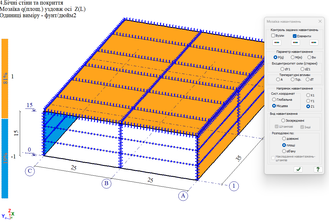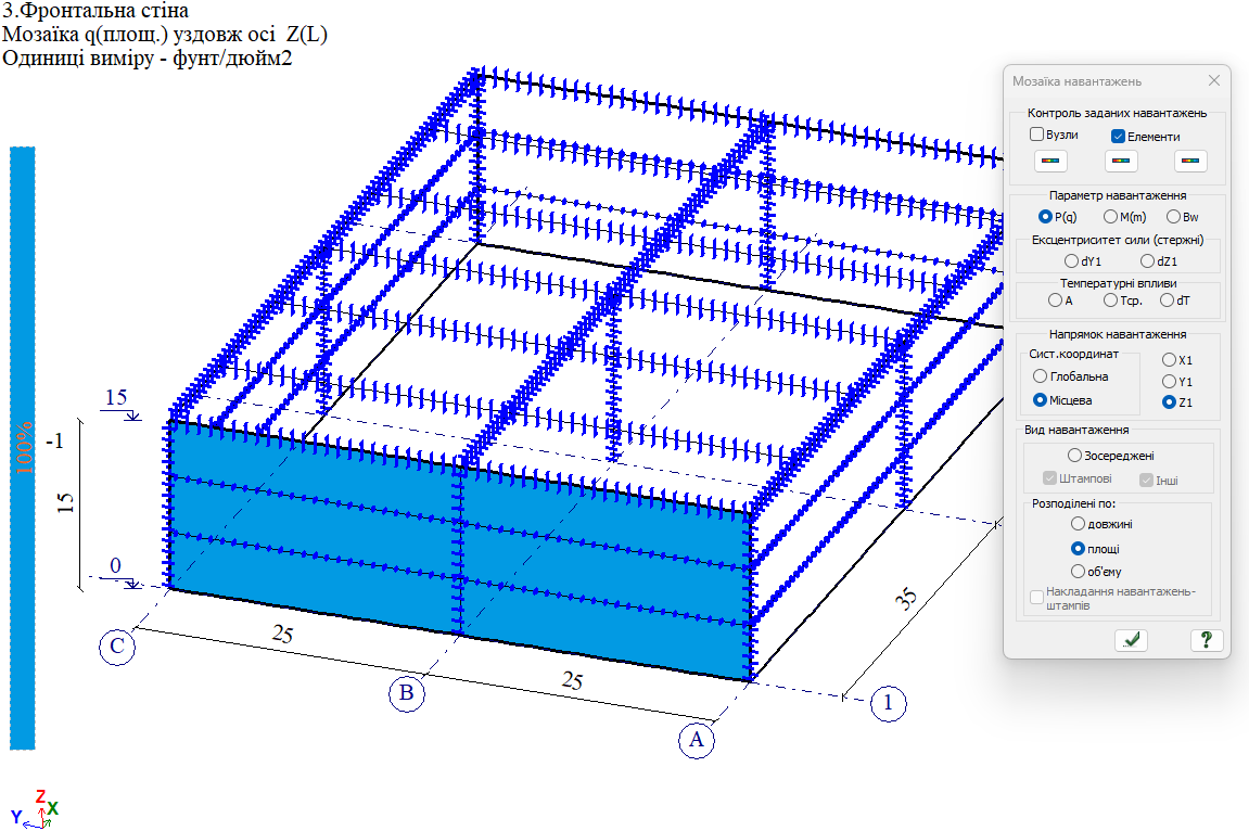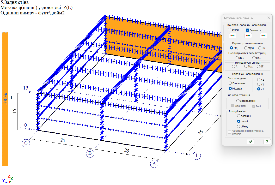 Відповідно третє завантаження – це статичне рівномірно розподілене по площі навантаження яке прикладено нормально (перпендикулярно) до поверхні фронтальної стіни.
