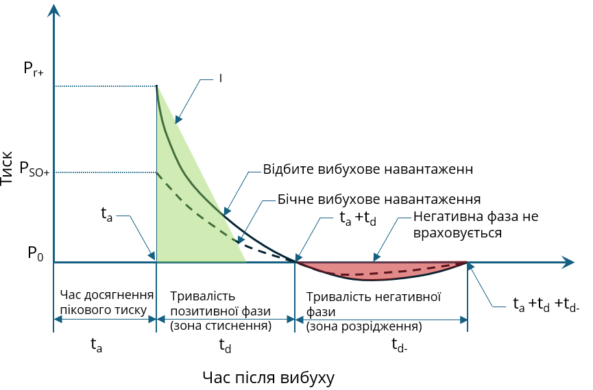 td - тривалість негативної фази (зона розрідження). Часовий інтервал, протягом якого тиск падає нижче атмосферного тиску після початкового піку. Відповідно, негативний імпульс вибуху визначається як інтеграл (площа під кривою) негативної фази графіка зміни тиску вибуху у часі. Цей імпульс відображає величину та тривалість зниження тиску під час негативної фази.