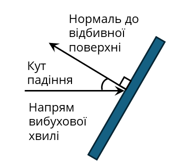 де Pso – це тангенціальний тиск (тиск, що діє паралельно до поверхні об'єкта) а Cr – коефіцієнт, який враховує відбиття повітряної ударної хвилі. Cr є функцією кута падіння хвилі та тангенціального тиску. На рисунку 2 показано, яким чином можна розрахувати кут падіння з урахуванням початкового напрямку вибухової хвилі та хвилі, відбитої від цієї поверхні по нормалі.