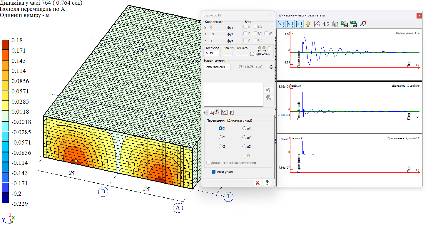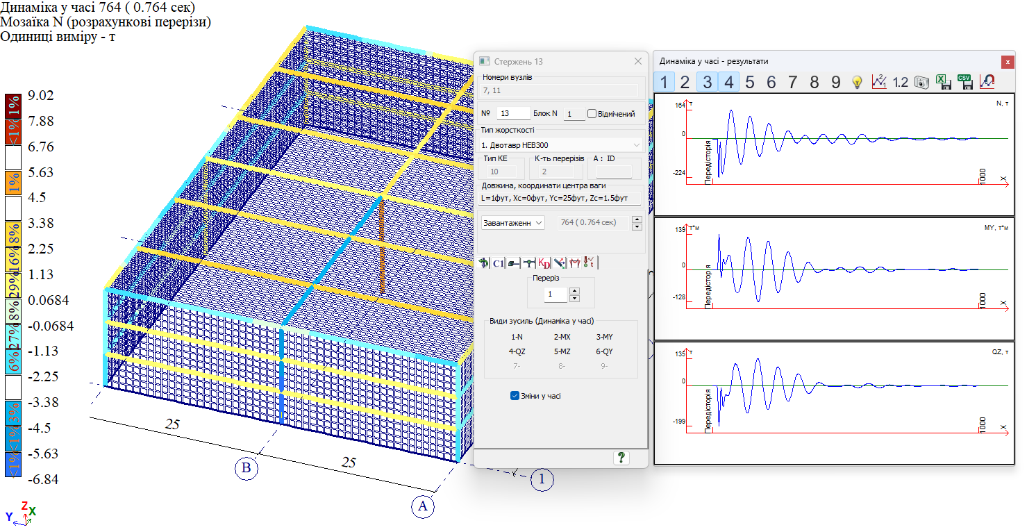 Отже після розрахунку ми маємо результати НДС для кожного моменту часу. Це дозволяє побудувати анімацію поведінки конструкцій при динамічному впливі.