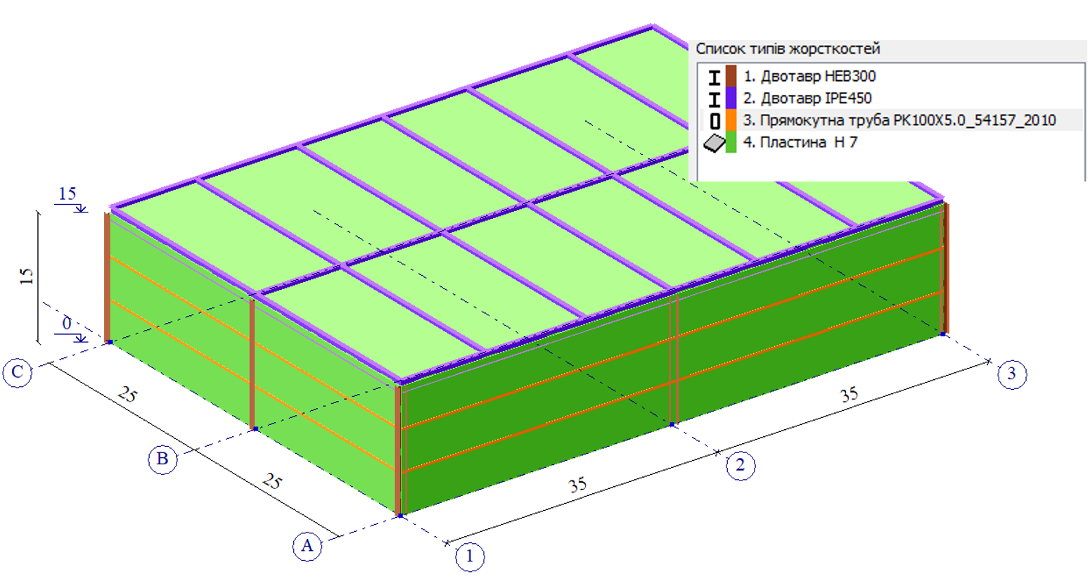 На основі прикладу 2.1 наведенного в AISC Design Guide 26 [1] продемонструємо особливості моделювання вибухового навантаження за допомогою програмного комплекса ЛІРА-САПР. У прикладі наведено одноповерхову будівлю (ширина 50 футів, довжина 70 футів, висота 15 футів). Колони, ригелі та прогони змодельовано в ЛІРА-САПР стержневими скінченними елементами, яким призначені сталеві типи жорсткості: стійки колон - двотавровий переріз HEB300, ригелі - двотавровий переріз IPE450, проміжні ригелі та прогони - прямокутна труба PK100X5.0. Стінові панелі та покриття змодельовані плоскими скінченними елементами оболонки.