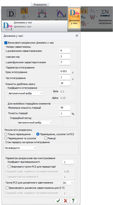 Після задання завантажень необхідно відкрити діалогове вікно Динаміка у часі і встановити прапорець Виконувати розрахунок Динаміки у часі. В цьому діалоговому вікні потрібно задати параметри інтегрування – крок та час інтегрування, кількість дроблень кроку інтегрування, а також вибрати потрібний склад результатів розрахунку: