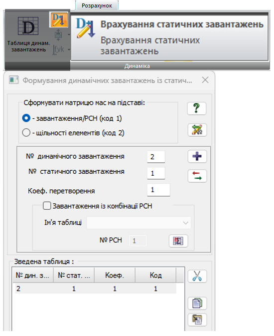 Друге завантаження – це ваги мас. Перетворення першого статичного завантаження в ваги мас виконується за допомогою команди Врахування статичних завантажень.