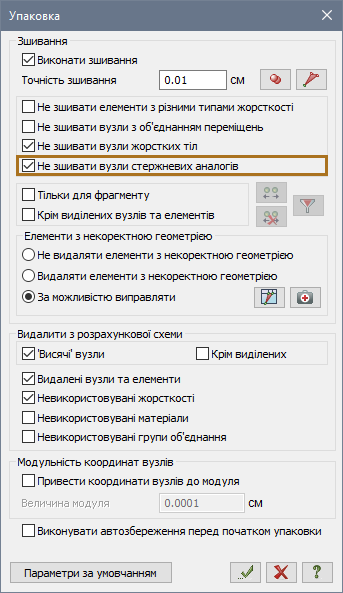 Встановлений прапорець «Не зшивати вузли стержневих аналогів» у діалоговому вікні «Упаковка» дозволяє уникнути об'єднання вузлів цільових елементів стержневих аналогів із вузлами інших елементів розрахункової схеми (рис.11).