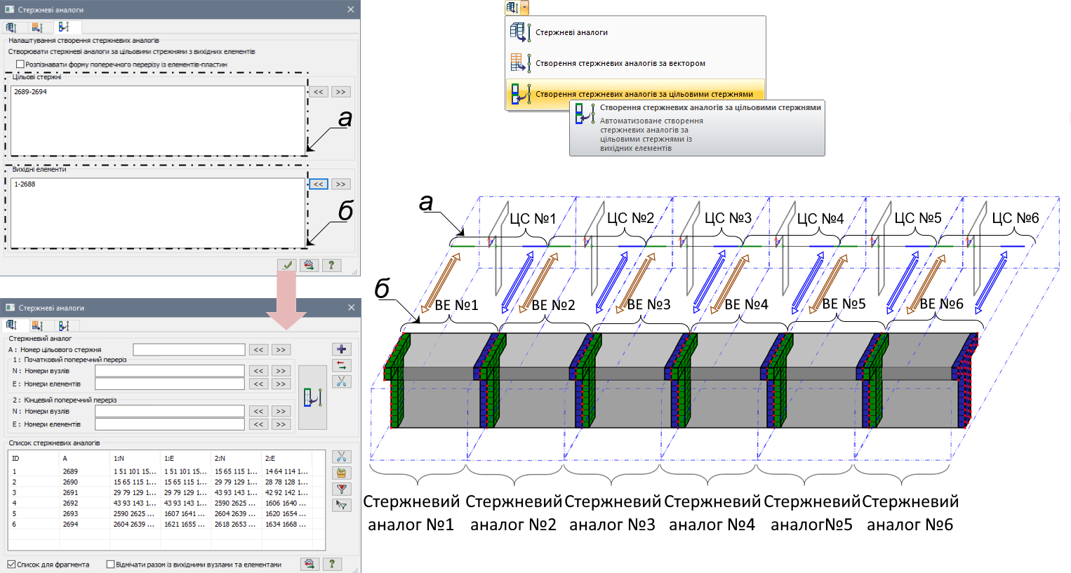 У діалоговому вікні «Стержневі аналоги» на закладці «Створення стержневих аналогів по вектору» можна виконати автоматизоване створення стержневих аналогів із наборів елементів зі створенням цільових стержнів по заданому вектору. (рис.7). Для цього необхідно: