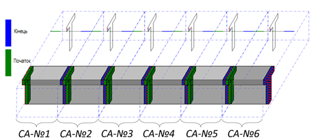 Для вказаного цільового стержня (рис.6, а) серед відмічених на схемі вихідних елементів (рис. 6, г) шукаються ті, що примикають до площин початкового (рис. 6, б) і кінцевого (рис. 6, в) перерізів цільового стержня з потрібної сторони (всередину стержня). У набір, що утворює складений переріз, включаються вузли, що лежать у площині складеного перерізу, та кінцеві елементи, що примикають до площини перерізу вузлами: стержні – одним вузлом, пластини – одним вузлом або ребром, об'ємні КЕ – одним вузлом, ребром або гранню.