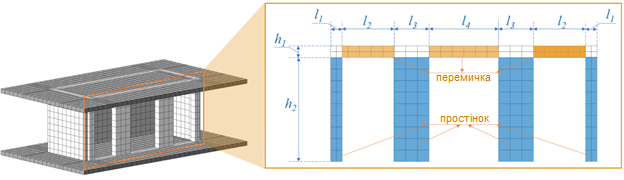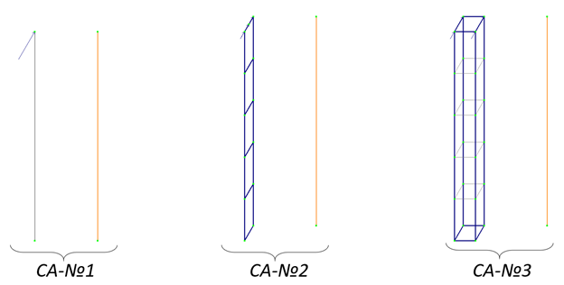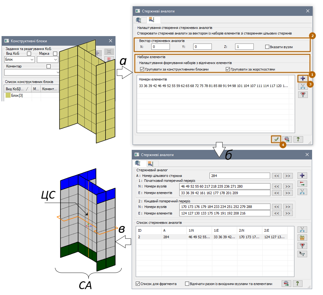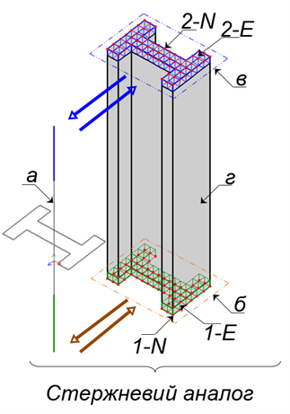Після натискання кнопки «Застосувати» кожен набір вихідних елементів буде проаналізовано: перпендикулярно до зазначеного вектору будуть побудовані площини початкового та кінцевого перерізів, визначені вихідні вузли та елементи, що примикають до цих площин. Якщо вихідні елементи СА змодельовані з пластин, то можна додатково виконати розпізнавання форми та розмірів поперечних перерізів. Якщо всі етапи аналізу пройшли успішно, то на основі набору вихідних елементів генерується стержневий аналог: у моделі створюється новий цільовий стержень з атрибутами стержневого аналогу. Вузли стержня розташовуються в геометричних центрах початкового та кінцевого складених перерізів. Тип жорсткості створеного стержня призначається виходячи з розпізнаного складеного перерізу: відповідний тип підбирається серед типів жорсткостей, що існують у моделі, або генерується автоматично (рис. 7 б-в).