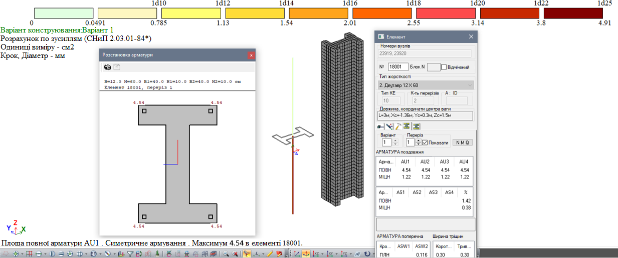 Обчислені внутрішні зусилля в перерізах цільового елемента стержневого аналога використовуються далі для визначення зусиль по РСН та РСЗ та в роботі конструюючих систем (підбір армування та/або перевірку заданого армування в залізобетонних та сталезалізобетонних елементах, перевірку та підбір поперечних перерізів сталевих елементів) (рис.12).