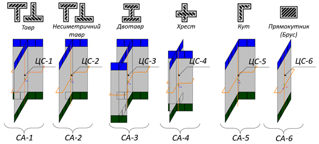Переріз цільового стержня СА в залежності від форми складеного перерізу набору вихідних об'єктів призначається тавровим, тавровим несиметричним, двотавровим, хрестовим, кутовим або прямокутним (брус). Розміри перерізу визначаються по розмірах ширини смуги (смуг) відповідного набору елементів-пластин та товщини пластин (рис.8).