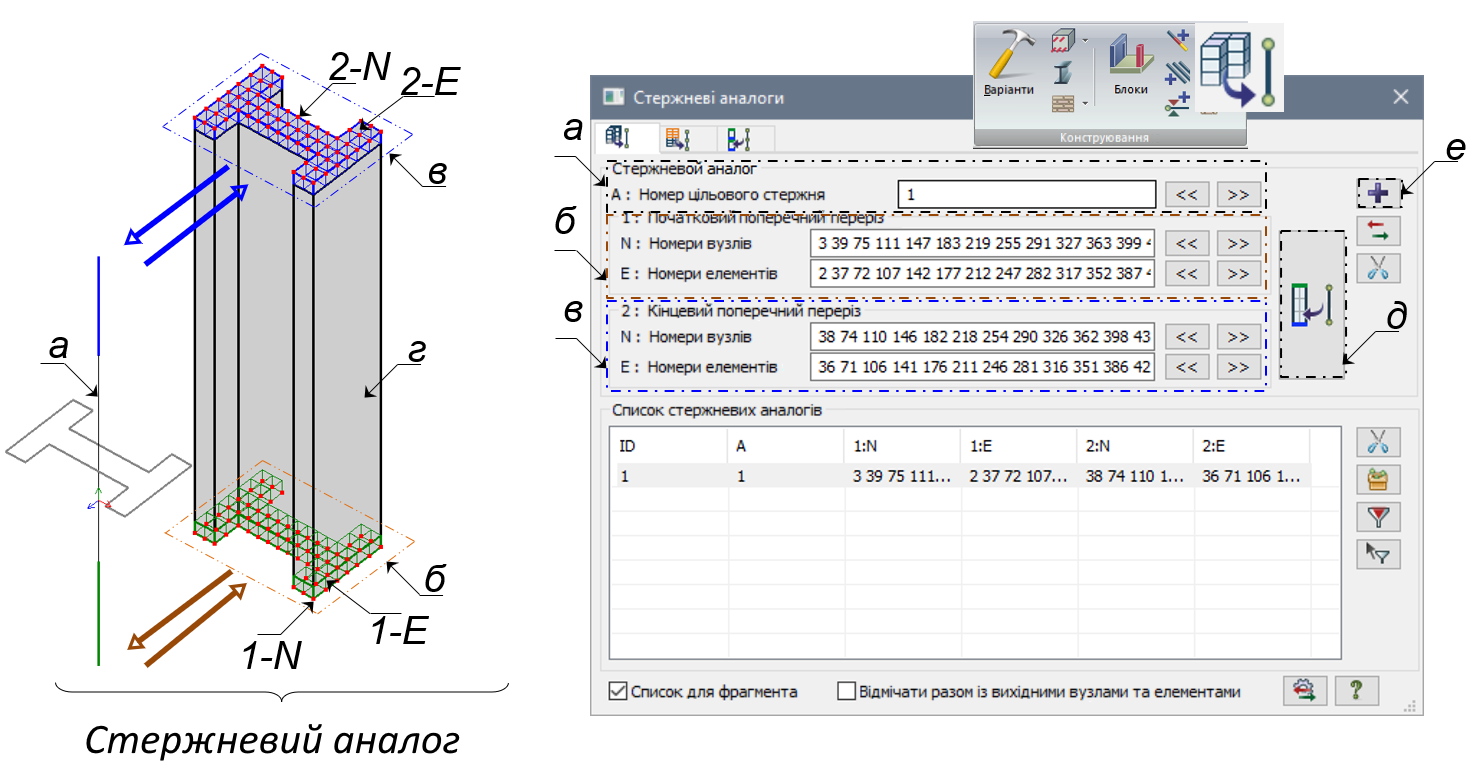 Після заповнення списку для створення СА потрібно виконати команду «Створити стержневий аналог» (рис. 6,е).