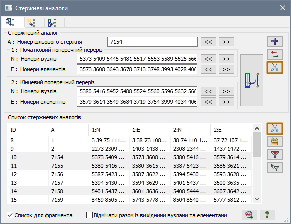 Створення, редагування та видалення стержневих аналогів виконується за допомогою діалогового вікна «Стержневі аналоги» (рис.6) наступними способами: