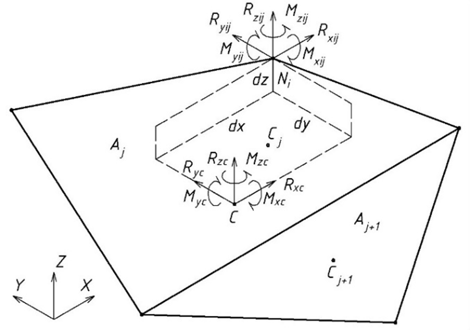 2.1. Визначається геометричний центр C складеного перерізу на основі площ примикання Aj з центрами ваги (xj; yj; zj) (2) вихідних скінченних елементів до площини складеного перерізу: для стержня площа його примикання розраховується на основі площі перерізу, для пластини - на основі товщини пластини та відстані між вузлами, для об'ємного КЕ - як площа грані, що прилягає до площини складеного перерізу.