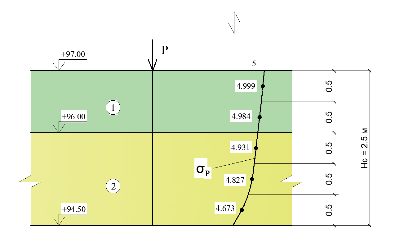 Розглянемо точку в центрі навантаження, з координатами [0,0]. На малюнку 2 представлені значення епюри напружень від зовнішнього навантаження (розраховані за методом Буссінеска), висота стисненої зони Нс та товщина елементарних шарів ґрунту у розглянутій точці.