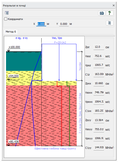 Де Zpz – це товща ґрунту, необхідна для аналізу роботи основи при поступальному русі частинок ґрунту, Zpxx, Zpyy – це товща ґрунту, необхідна для аналізу роботи основи при коливальному русі. Докладніше про нього розписано у Прикладі розрахунку, пункт 2.2.