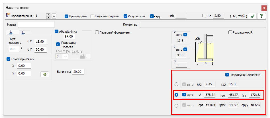 Ефективна глибина ґрунтової товщі визначається у діалозі “Навантаження” (або “Імпортовані навантаження”). Після натискання на позначку "Розрахунок динаміки" (Рисунок 8) відкривається поле з вибором методу розрахунку ефективних глибин Zpz, Zpxx, Zpyy. У розрахунку запропоновано три варіанти визначення ефективних глибин ґрунтової товщі.
