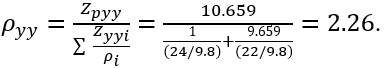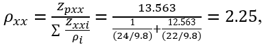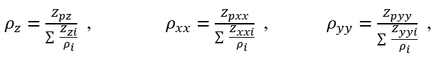 Де ρz, ρxx, ρyy – середні питомі маси ґрунту, що знаходяться аналогічним чином, як і швидкості розповсюдження поперечних та поздовжніх хвиль, що використовуються при розрахунку коефіцієнтів Пуассона у формулах (5). Тобто значення ρz, ρxx, ρyy розраховуються як середні арифметичні по навантаженню від усереднених значень питомої ваги ρz, ρxx, ρyy у кожній точці, що були розраховані за формулами: