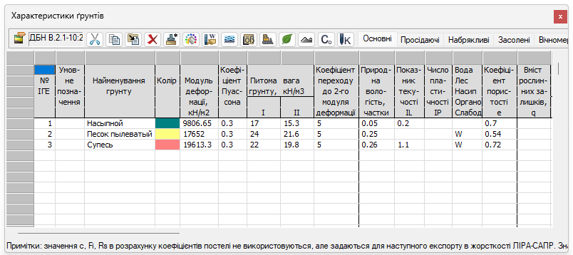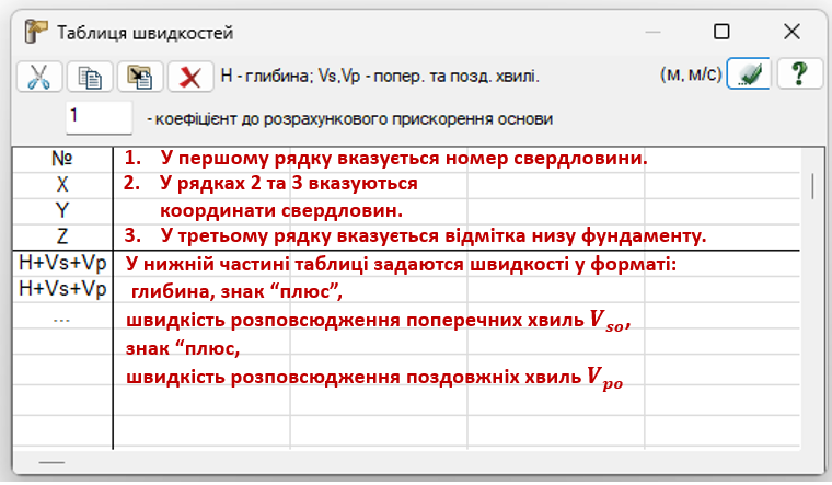 Де Vsi, Vpi – це експериментальні значення швидкостей розповсюдження поперечних та поздовжніх хвиль в елементарному шарі ґрунту, які задаються користувачем.