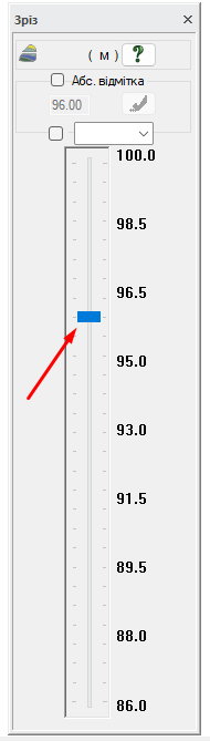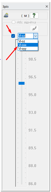 При натисканні на вкладку Vsoi або Vpoi відкривається діалог "Зріз". Використовуючи скрол у діалозі “Зріз” (Рис. 13), є можливість вказати відмітку, де необхідно показати значення заданих швидкостей розповсюдження поперечних або поздовжніх хвиль.