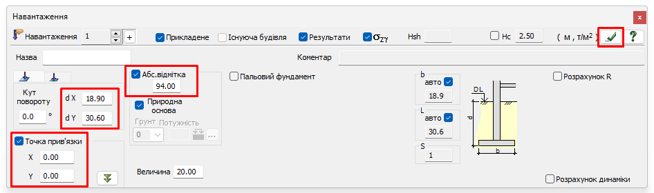 Де A – площа навантаження, Ixx, Iyy – моменти інерції навантаження. У разі використання навантаження нестандартної форми значення A, Ixx, Iyy визначаються за фактичними розмірами фігури.