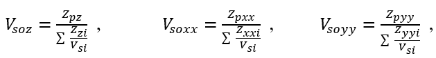 Швидкості хвиль Vsoz, Vsoxx, Vsoyy, Vpoz, Vpoxx, Vpoyy для розрахунку коефіцієнтів пружної основи визначаються як середні арифметичні по навантаженню від усереднених швидкостей хвиль у кожній точці. Значення усереднених швидкостей хвиль у кожній точці навантаження розраховуються за формулами: