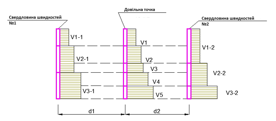 де Vi – швидкості розповсюдження хвиль, які ввів користувач у i-тій свердловині (рис. 10); λi – це ваговий коефіцієнт Лямбда, що залежить від відстані до свердловини і визначається за формулою: