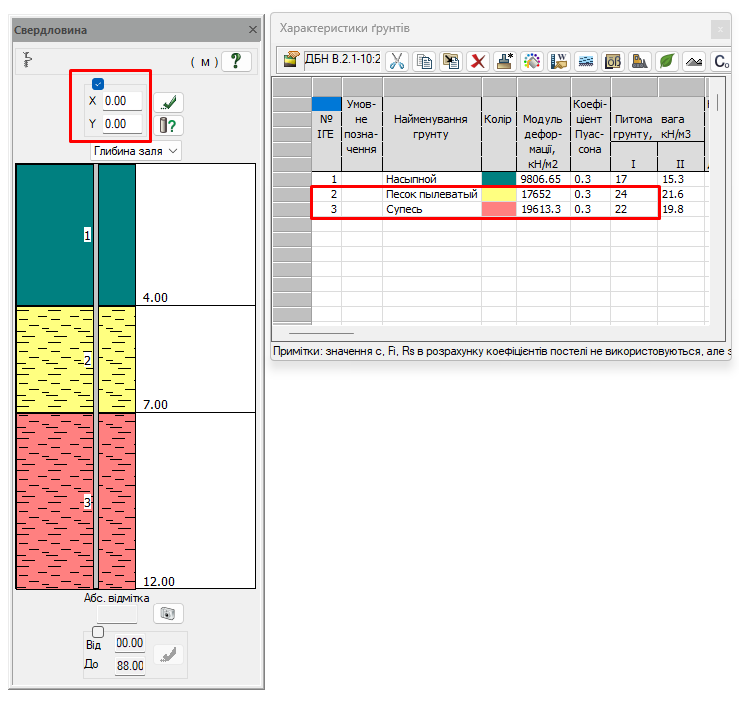 Для розрахунку усереднених значення питомої ваги ґрунту використовуємо дані ІГЕ у точці з координатами [0,0], (Рис. 11). Запишемо розрахунок усереднених значень питомої ваги у точці, що розглядається: