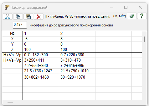 Для виконання розрахунку за Методом 6 необхідно ввести експериментальні значення швидкостей розповсюдження пружних хвиль у шарах ґрунтової товщі на будівельному майданчику. Припустимо, що у нас є дві свердловини з експериментальними значеннями швидкостей розповсюдження хвиль у пружному середовищі, значення яких наведені у таблиці: