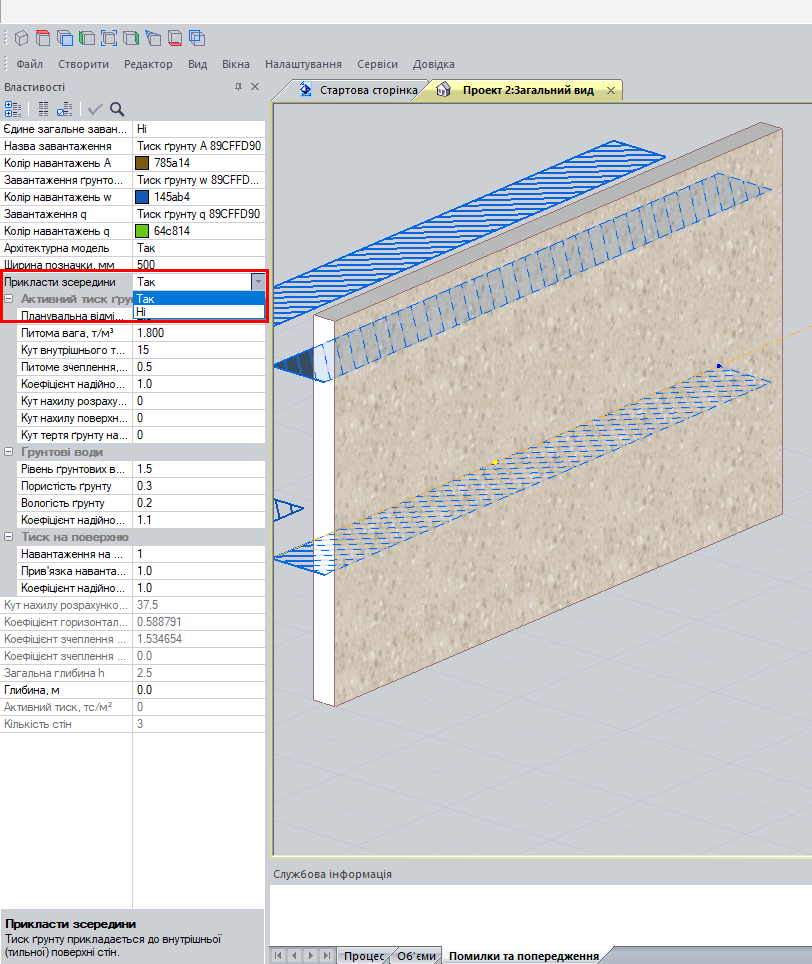 Якщо змінювати напрямок лицьового боку стіни небажано при тому, що потрібно змінити напрямок дії тиску ґрунту - можна скористатися параметром у властивостях моделі ґрунту «Прикласти зсередини».